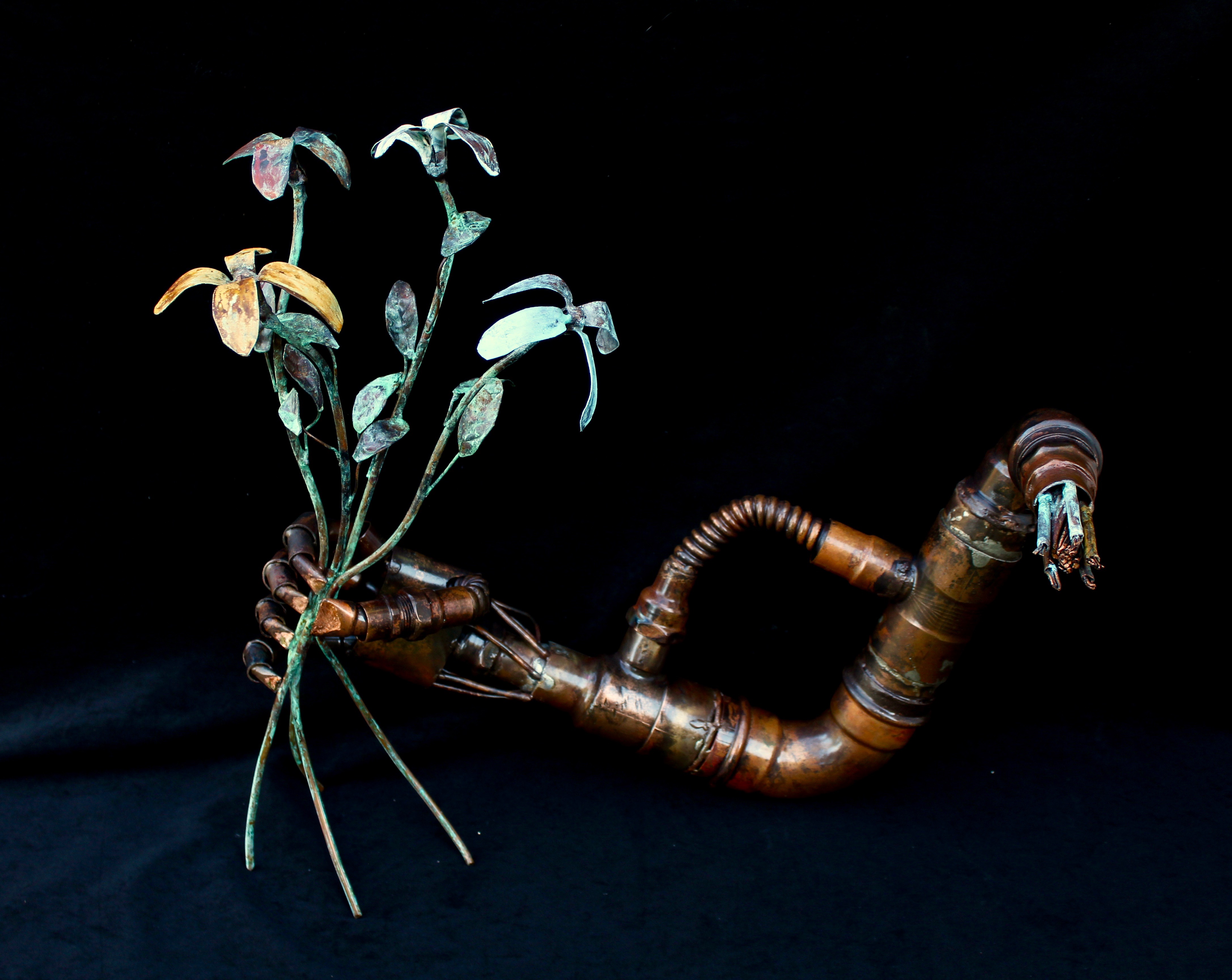 | You throw yourself into your art. Each piece is a representation of you and includes a part of you. For this piece, I used left over copper from other pieces, trying to leave them as they were, piled in a bucket. I only had to bend some here and there to make them connect. These are the remnants, the pieces of my soul. |